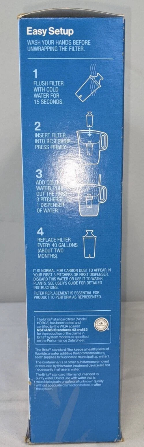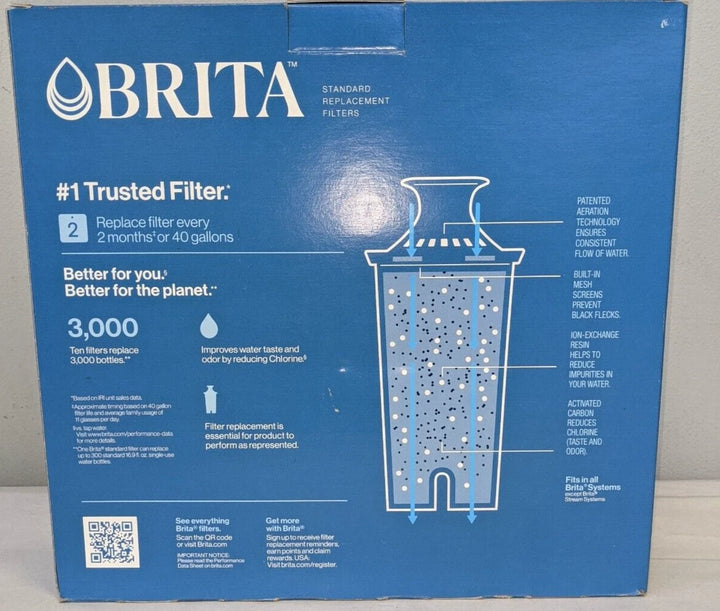 Enjoy cleaner, great-tasting water with this Brita Standard Replacement Water Filter 10-Pack. Designed to reduce chlorine, copper, mercury, and other impurities, these filters fit all Brita pitchers and dispensers (except Stream). Open box inspected only — new and unused.