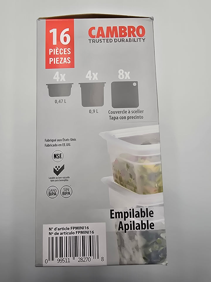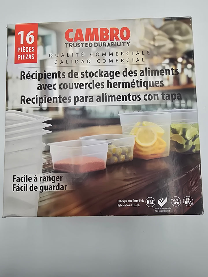 Includes 16 durable Cambro food storage containers with lids