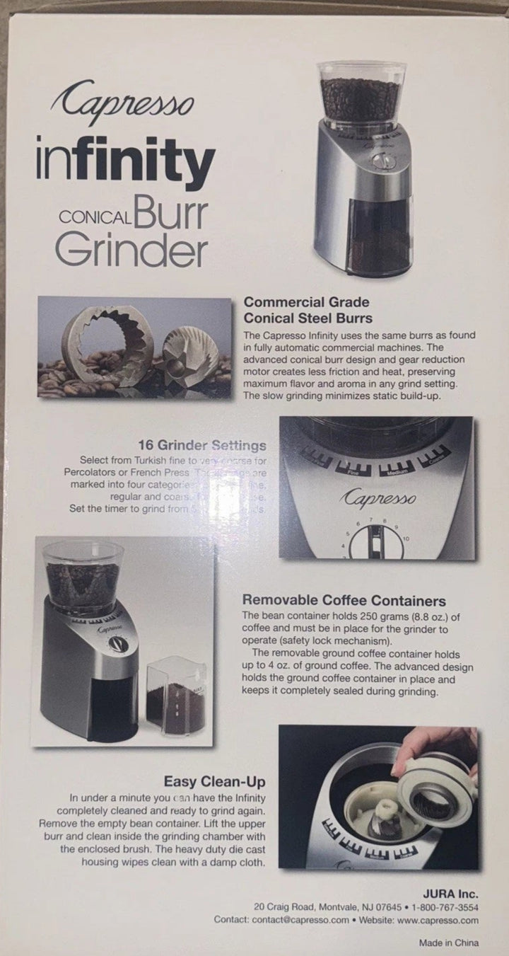 Grind coffee beans to perfection with the Capresso Infinity Conical Burr Grinder. Featuring commercial-grade stainless steel conical burrs and multiple grind settings, it delivers consistent grounds for espresso, drip coffee, French press, and more. A durable and reliable grinder for coffee lovers.