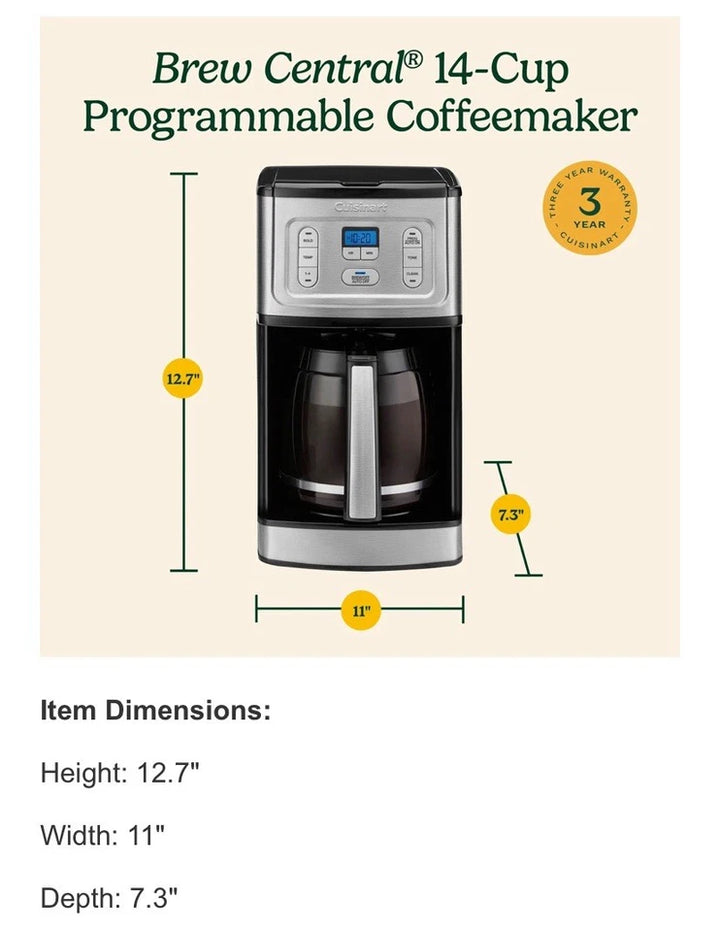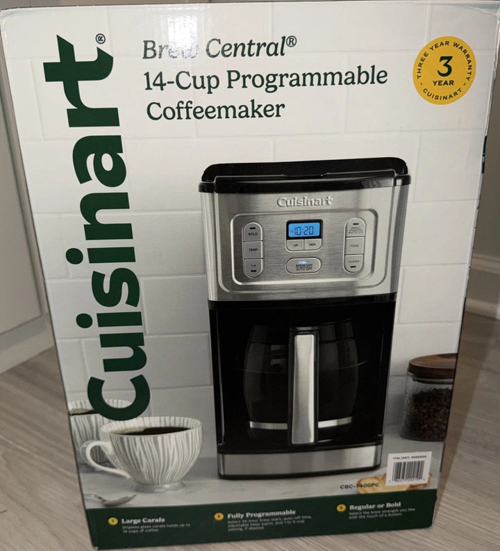 Brew fresh coffee every morning with the Cuisinart CBC-7400PC Brew Central 14-Cup Coffee Maker. Featuring programmable controls, adjustable brew strength, and a large glass carafe, this machine is perfect for home or office use. Item is Open Box – New, never used, and inspected to ensure excellent condition. Box may show light shelf wear.
