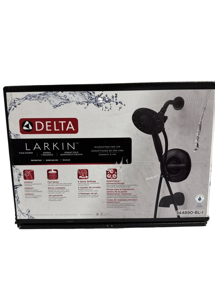 NEW Delta Larkin 144890-BL-I Monitor 14 Series tub and shower faucet set in a sleek matte black finish. Designed with Delta’s reliable Monitor® pressure balance valve to help maintain water temperature, this set combines durability with modern style for any bathroom upgrade.