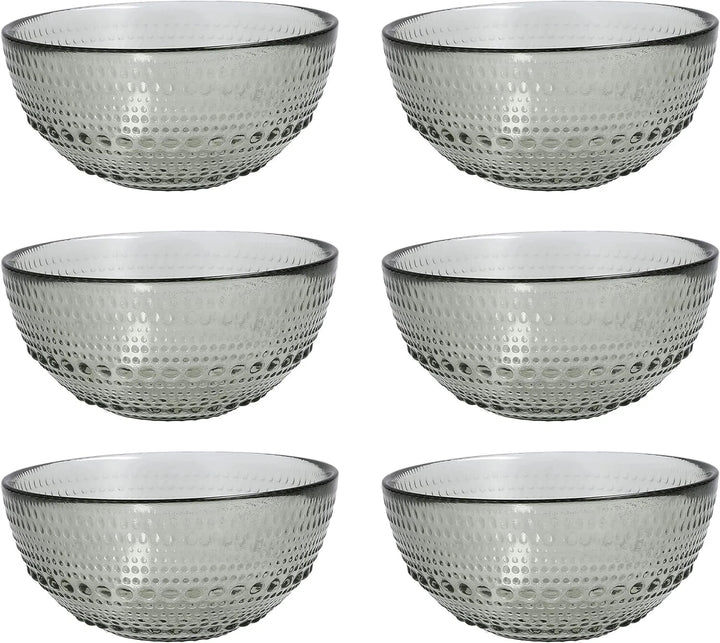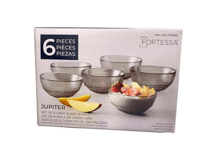The Fortessa Jupiter gray crystal glass bowl set combines elegance and functionality with a distinctive beaded design. Each 13.5 oz bowl is crafted from fine lead-free crystal, perfect for serving desserts, fruits, or small dishes. This 6-piece set adds timeless style to any table.