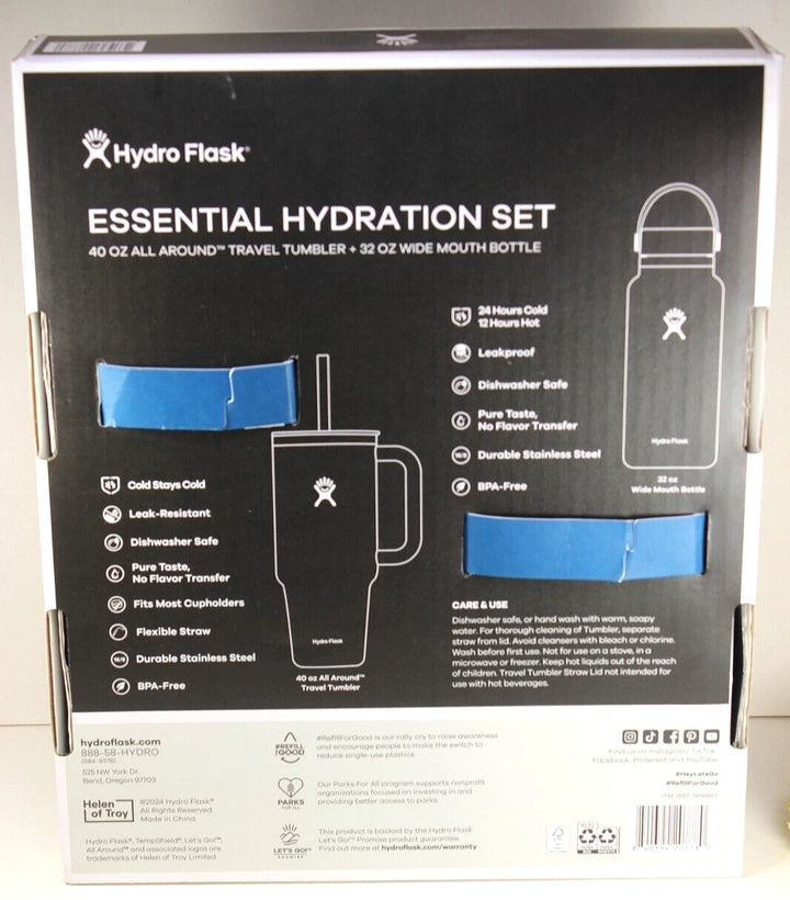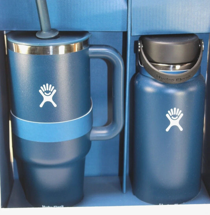 Stay hydrated on the go with this Hydro Flask Hydration Set featuring a 40oz tumbler and a 32oz bottle. Designed in a sleek navy finish, both pieces keep drinks cold for hours and hot beverages warm, making them perfect for daily use, travel, or outdoor adventures.