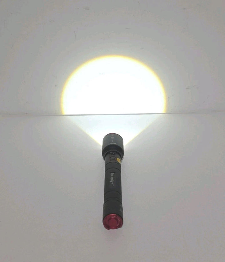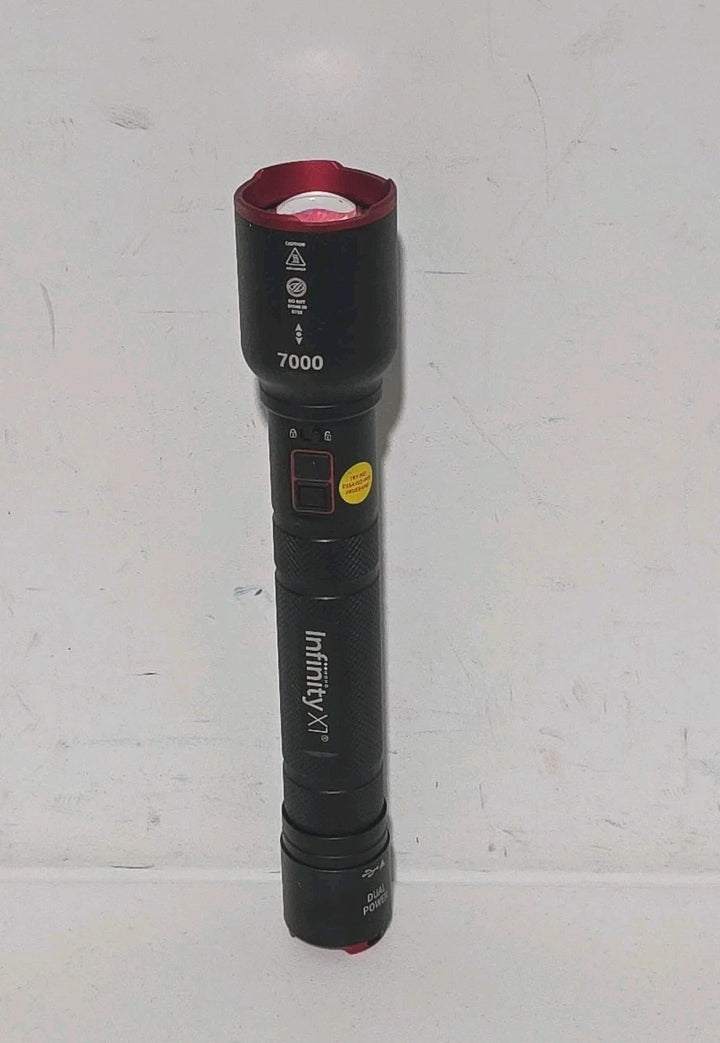 This Infinity X1 7000L Dual Power Flashlight delivers an incredibly bright 7000-lumen beam using high-performance CREE LED technology. Fully tested and working great, it provides powerful illumination for emergencies, outdoor activities, work sites, and home use. Dual-power capability gives you flexibility with both rechargeable and standard battery options.