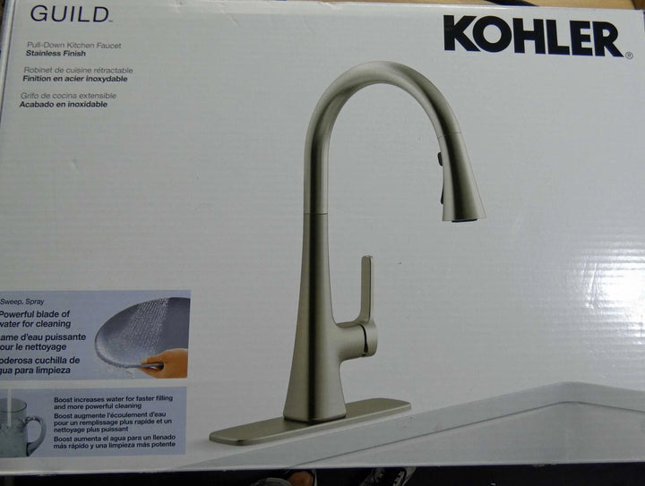 The Kohler Guild K-R33912-VS kitchen faucet offers a sleek design and versatile performance. With a pull-down sprayhead featuring 3 functions (stream, sweep, and boost), it delivers convenience for everyday tasks. Pre-owned in excellent condition and comes with the original box.