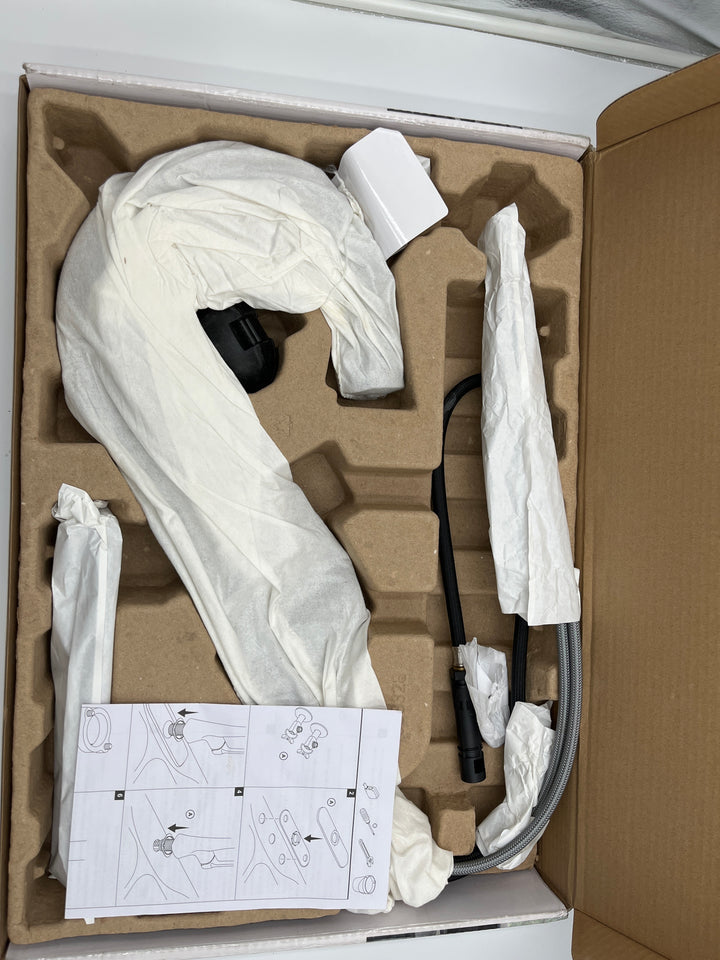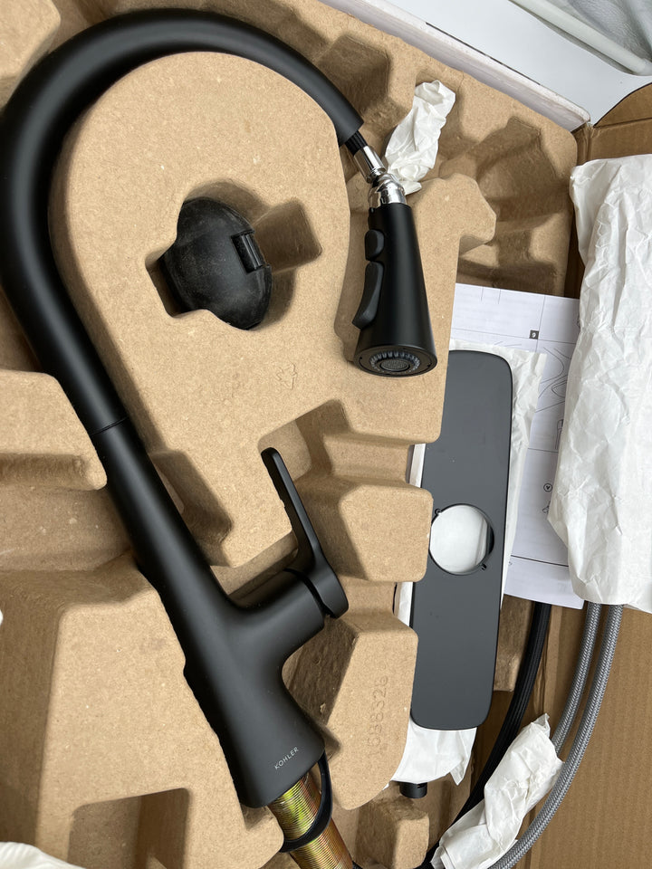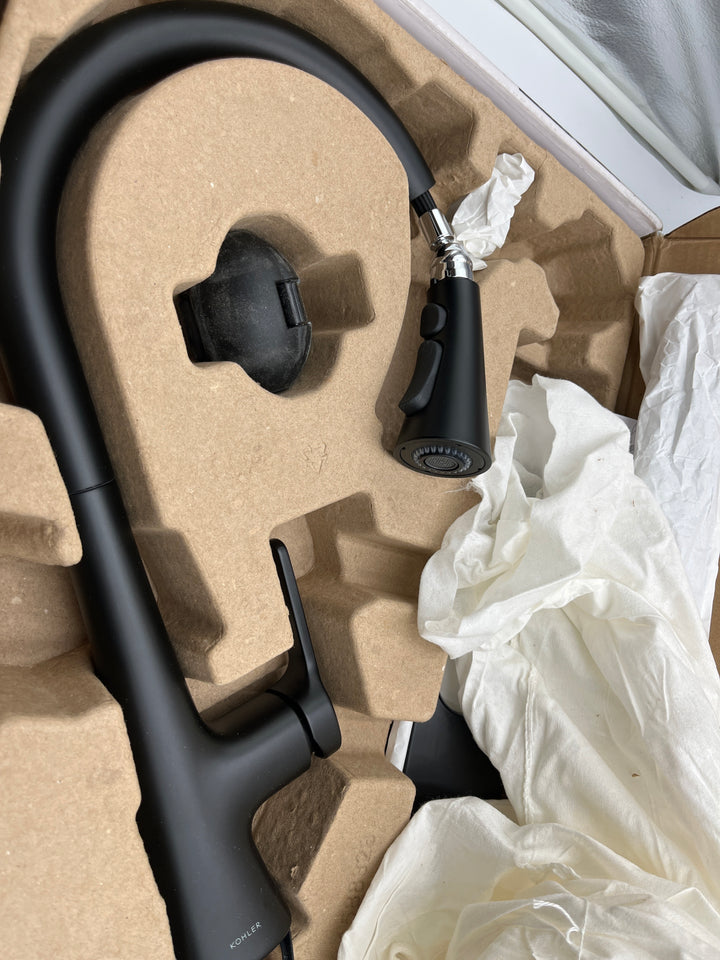 The Kohler Guild R33912-BL-AA kitchen faucet in matte black combines style with performance. Featuring a pull-down sprayhead with Boost and Sweep spray functions, it delivers powerful cleaning and everyday convenience. Pre-owned in excellent condition and fully functional.