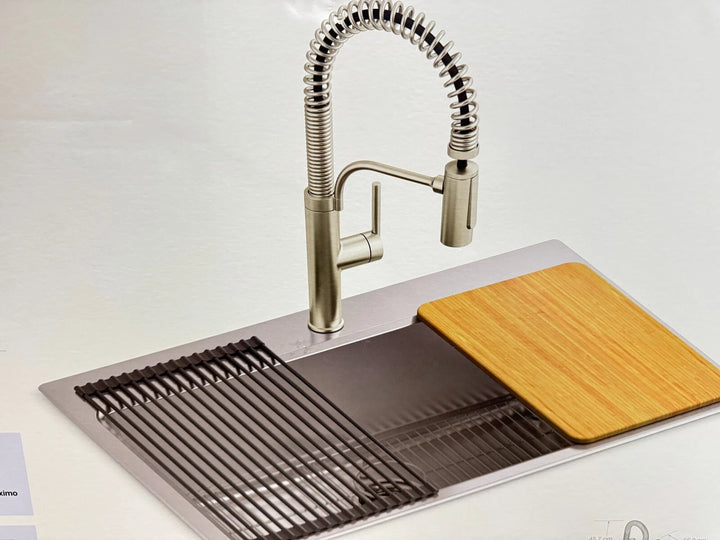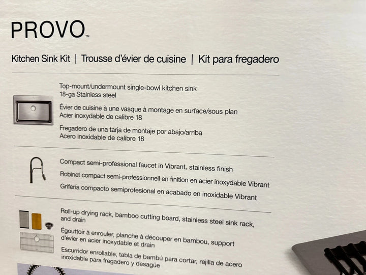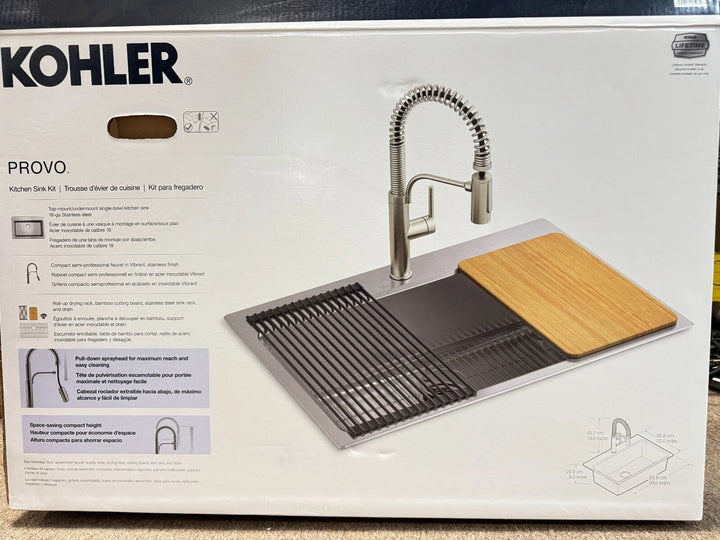 The Kohler Provo 33" dual-mount single-bowl kitchen sink offers durable stainless steel construction and versatile installation. Designed with Kohler reliability, it provides a sleek, modern look while standing up to everyday use. new condition with original packaging.