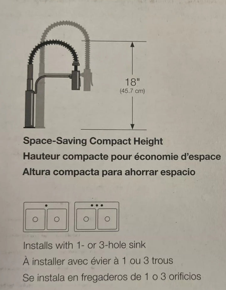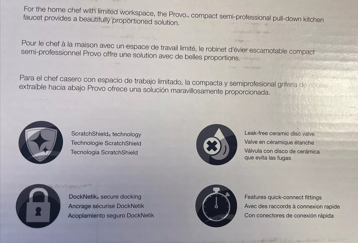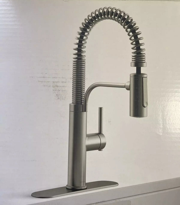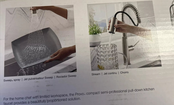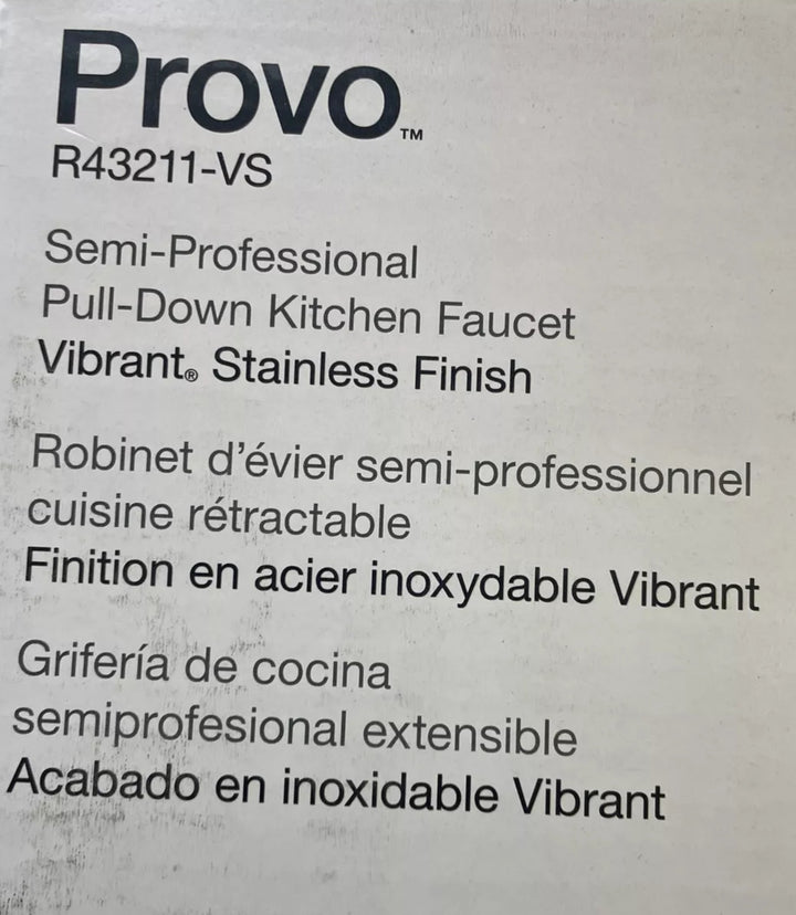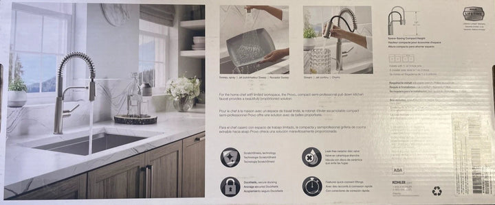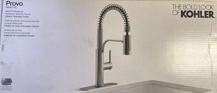 The Kohler R43211-VS Provo pulldown kitchen faucet combines elegant style with lasting durability. Finished in vibrant stainless, it offers smooth operation, reliable performance, and a sleek modern look. Open box, never used – new condition with original packaging.