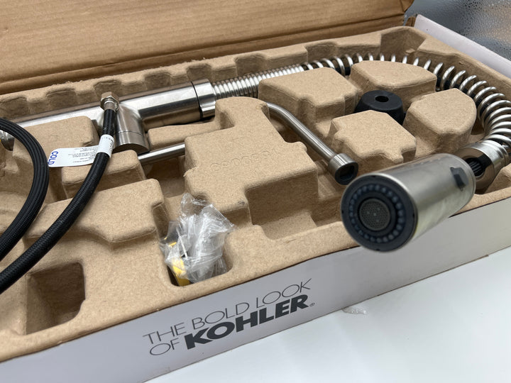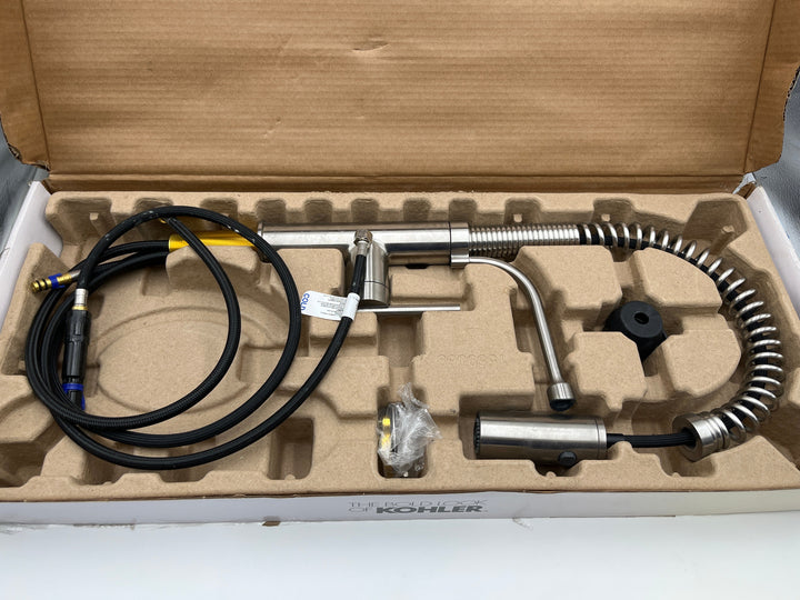 The Kohler R43211-VS Provo kitchen faucet delivers a professional look with practical functionality. Its pull-down sprayhead offers flexible use for everyday kitchen tasks, while the Vibrant Stainless finish resists tarnish and corrosion. Pre-owned in excellent condition and comes in the original box.