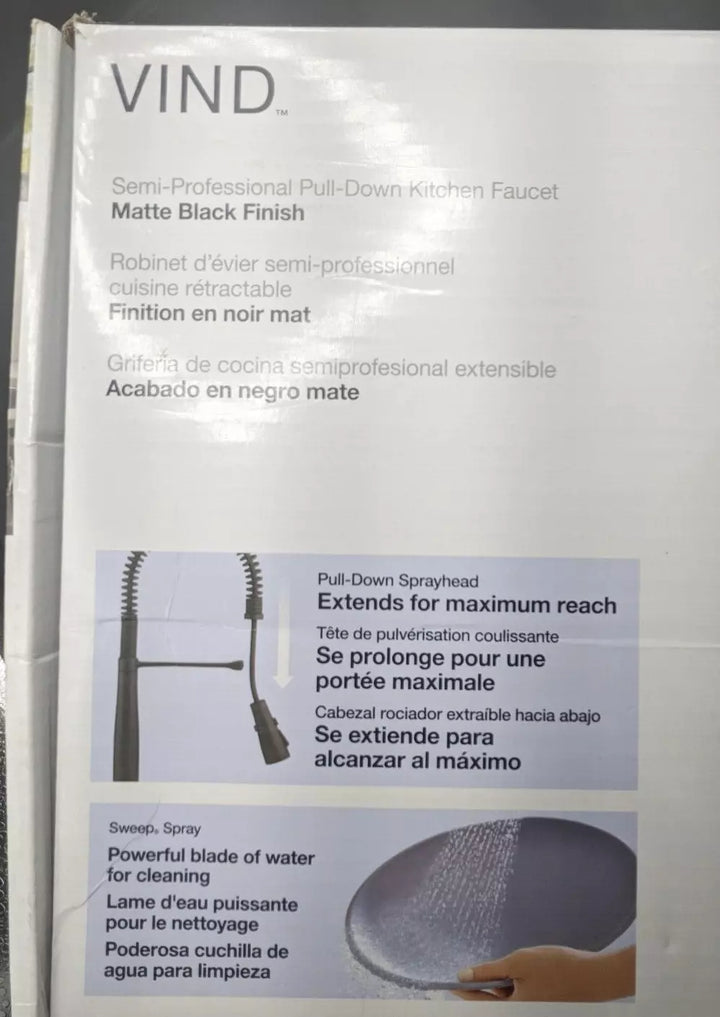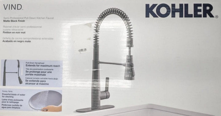 Kohler Vind semi-professional kitchen faucet in a stunning matte black finish. Designed with a commercial-inspired style and flexible spray hose, it offers both power and convenience for everyday kitchen tasks. Perfect upgrade for a modern kitchen with durable construction and sleek design.