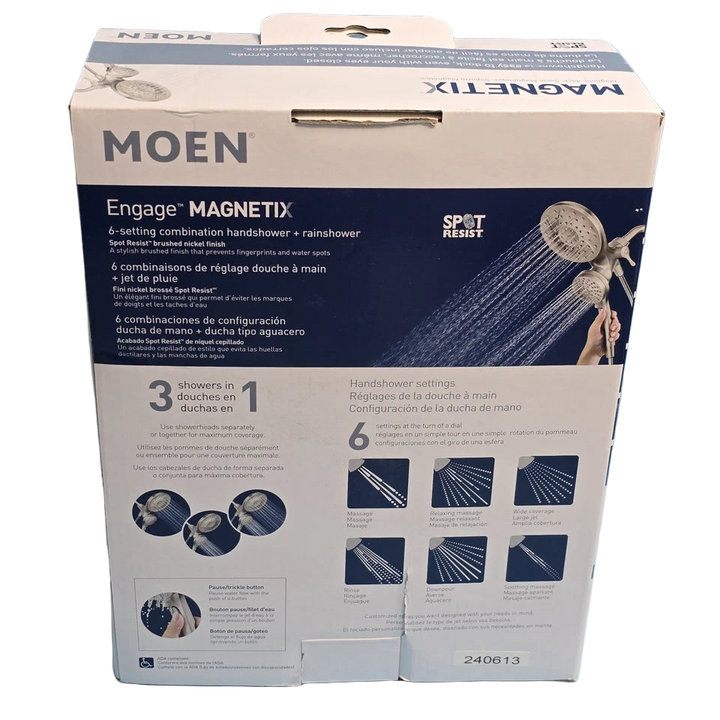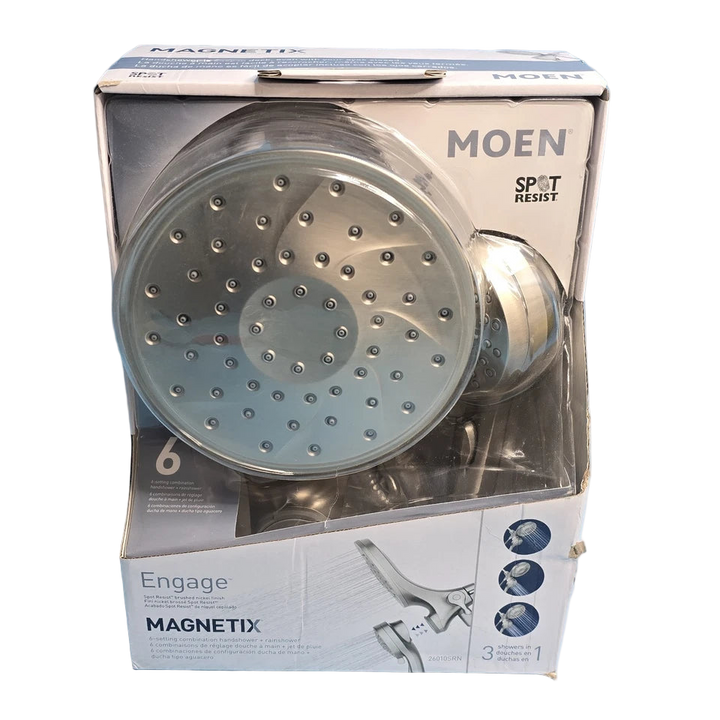 Upgrade your bathroom with the Moen Engage dual shower system featuring Magnetix technology. Model 26010SRN includes both a handheld shower and a fixed showerhead in a Spot Resist Brushed Nickel finish that resists fingerprints and water spots. Item is open box, inspected, never installed, and in excellent condition.