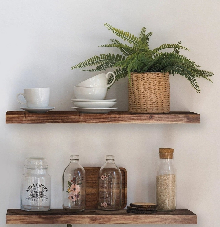 The Vision Home acacia floating shelves add natural beauty and functionality to any room. At 24 inches wide, this set of two shelves is perfect for displaying décor, books, or kitchen essentials. Crafted from durable acacia wood, they bring warmth and style to modern or traditional spaces.